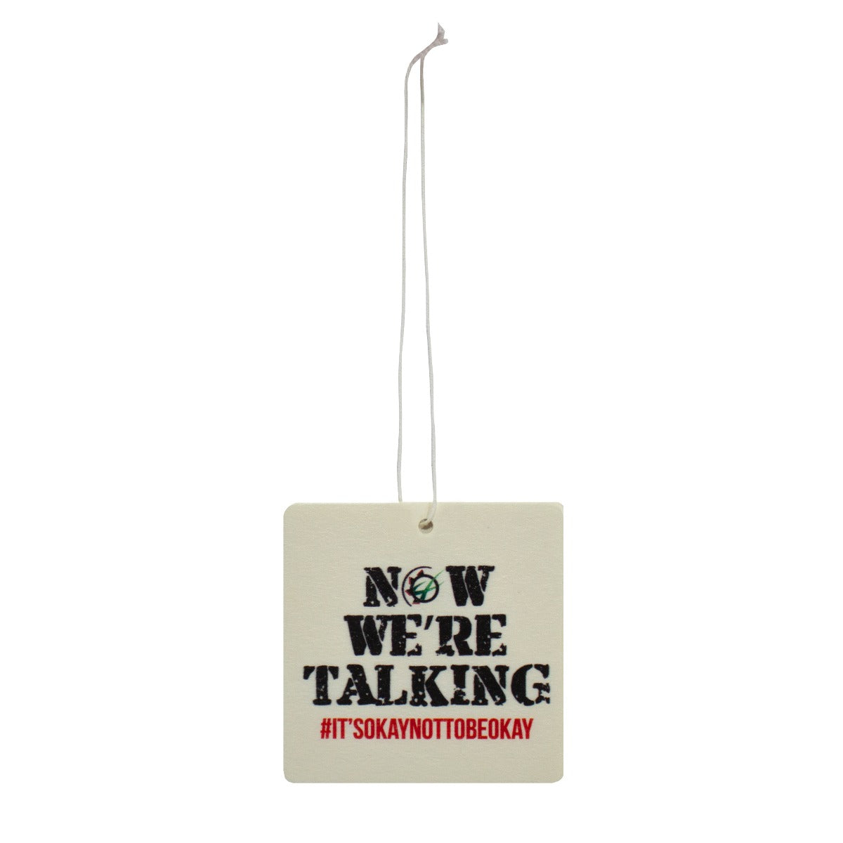 "GRASSMEN" hanging air freshener with "GRASSMEN" logo to one side & our NOW WE'RE TALKING #itsokaynottobeokay logo to the other.