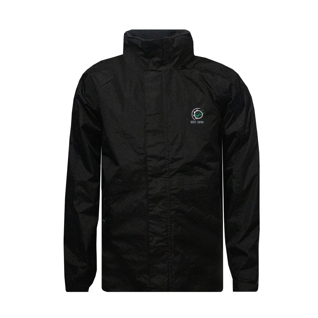 Practical details include a concealed hood with adjusters, a stormflap with hook-and-loop fastening, and adjustable cuffs for a secure fit. Storage is well covered with two lower zipped pockets and an inner patch security pocket. A concealed zip entrance in the lining allows easy access for embroidery and custom branding.