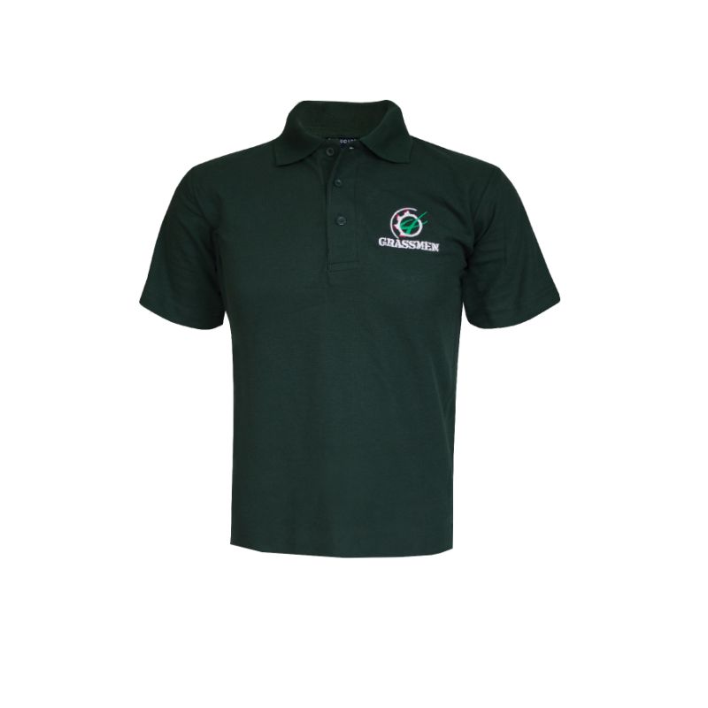 The original "GRASSMEN" logo is embroidered to the left side of the chest and on the back. The polo shirt also features a button fastening, ribbed collar and cuffs and is made from polyester and cotton.